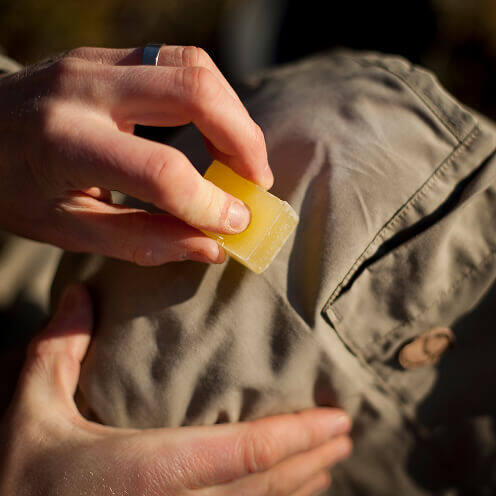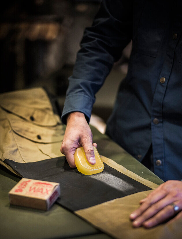 在G-1000®面料上涂抹格陵兰蜡,然后用慰斗或吹风机加热,使蜡慢慢渗入到织物纤维中。